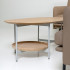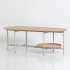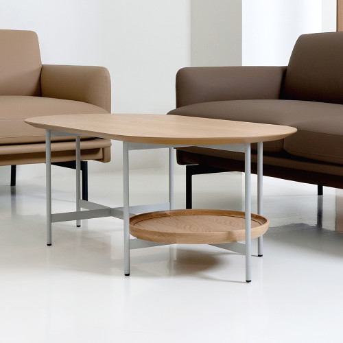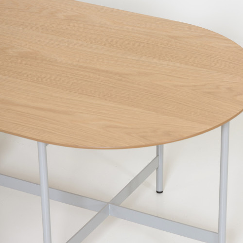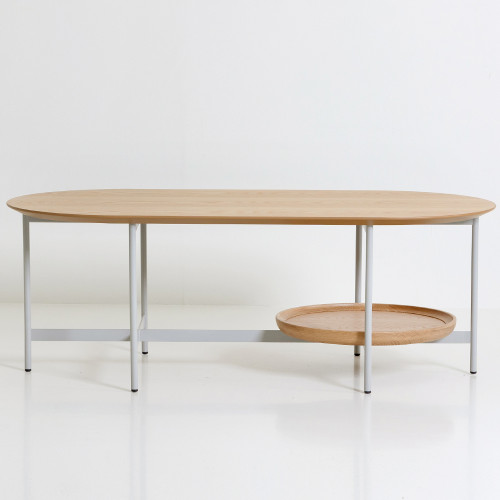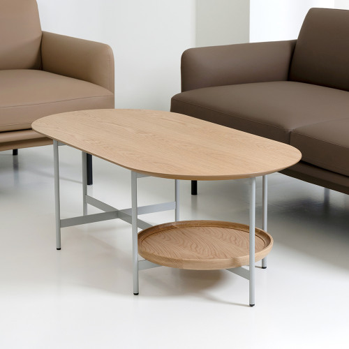 상판 : MDF 위 화이트 오크 천연무늬목 / 엣지 : 네츄럴 도장 원반 : 화이트 오크 원목 프레임 : 철재 위 라이트그레이 분체도장